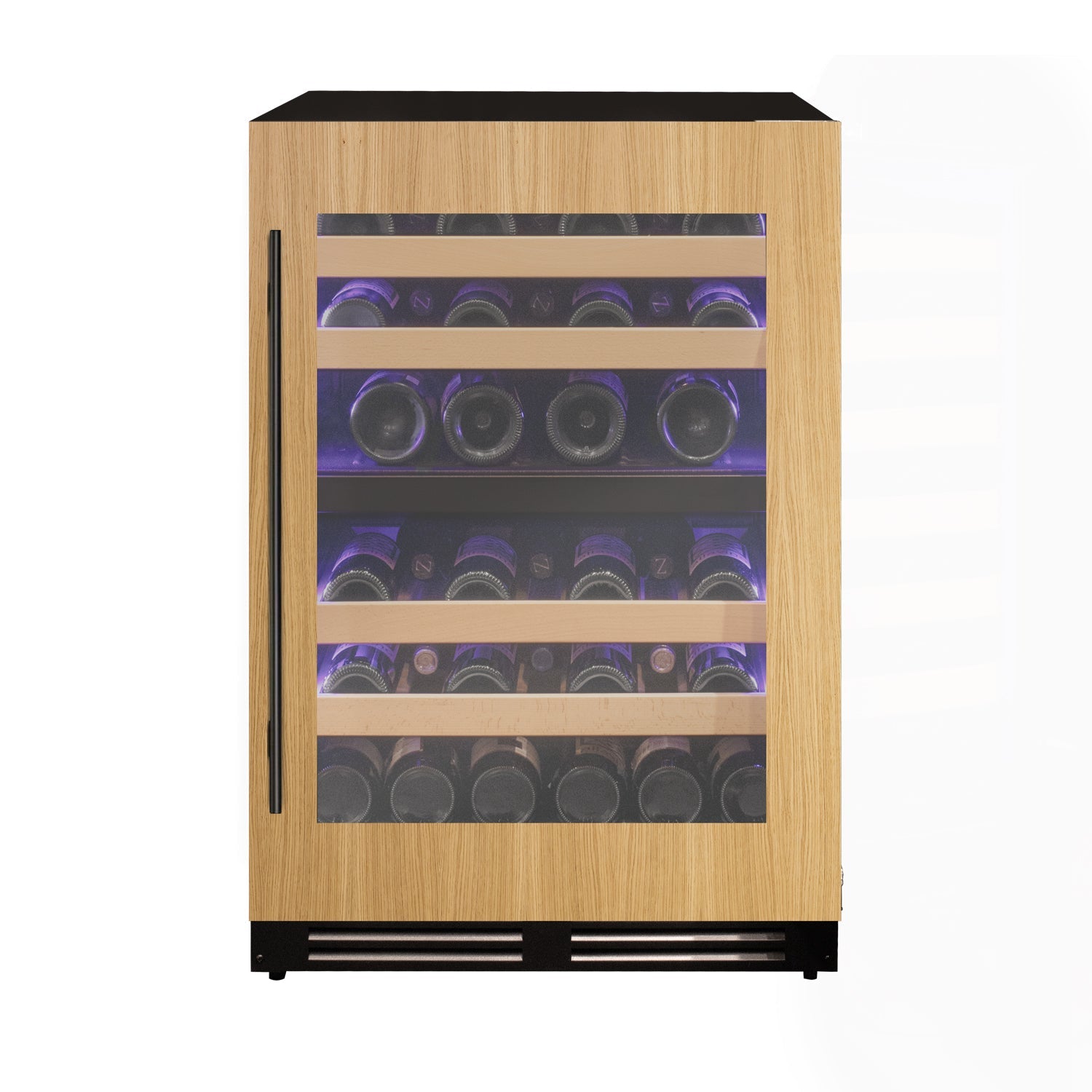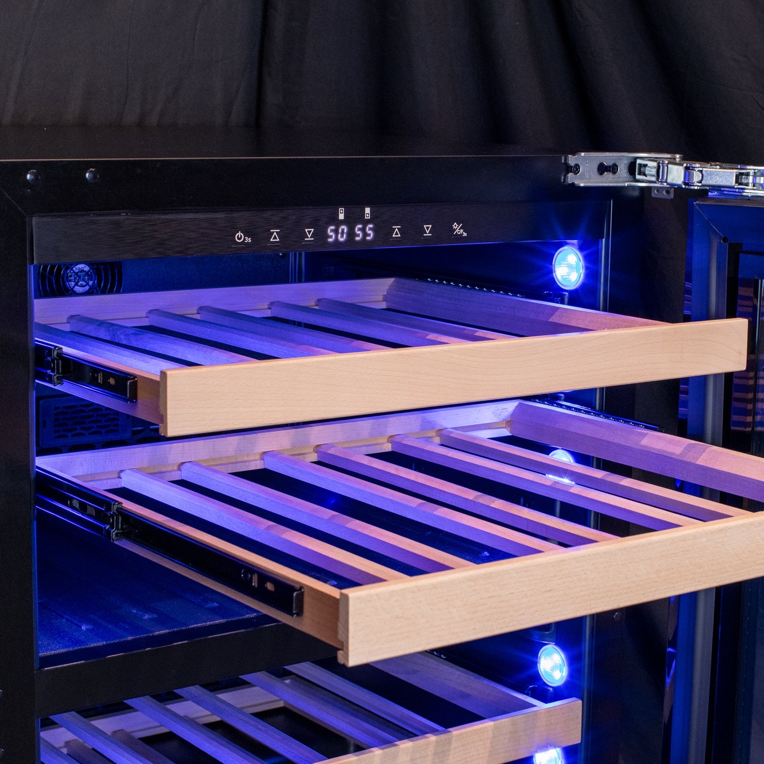 The interior features Allavino’s wood-front shelving system, designed to reduce vibration while securely cradling bottles. Shelves are removable and repositionable, offering flexibility for various bottle sizes and shapes. Smooth glide-out shelves provide easy access to the collection without disturbing stored wines.