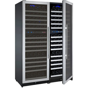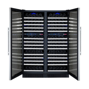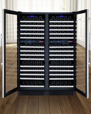 This model is composed of two dual-zone 172-bottle wine refrigerators with opposite hinged doors placed side by side, creating four independently controlled temperature zones. Separate digital control panels allow precise temperature adjustments, making it easy to store multiple wine styles at their ideal conditions.