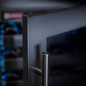 A black stainless steel, left-hinged door with UV-protective glass helps shield wine from harmful light exposure. The black interior liner, customizable colored LED lighting, locking door, and automatic defrost system create a secure, low-maintenance, and visually cohesive wine storage solution suitable for modern residential environments.